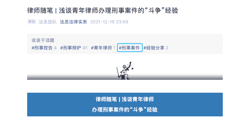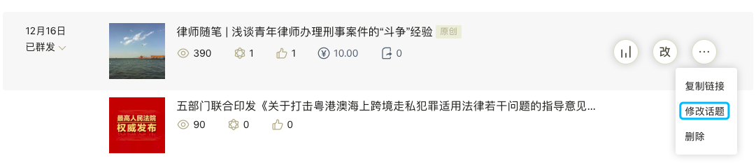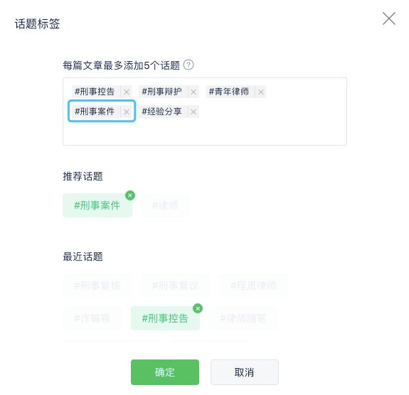 我之前发表了一篇原创文章《律师随笔 | 浅谈青年律师办理刑事案件的“斗争”经验》,一开始编辑的时候没有添加话题,发表后才添加的话题,话题有:#刑事控告、#刑事辩护、#青年律师、#刑事案件、#经验分享,后面又改动了一下,把话题#刑事案件改为了#律师随笔,但是重新打开文章后发现没有改成功,同时之前的话题#刑事案件也打不开了。到目前为止,话题还是修改不成功,请微信团队了解一下,尽快解决这个问题。感谢了!