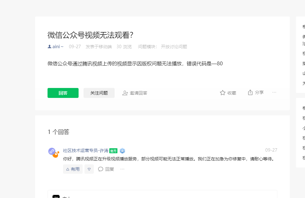 公众号里面所有的文章的视频突然下都无法播放,现实因版权限制,该视频不支持播放,下面是其中公众号其中一个文章示例,麻烦处理,谢谢!
