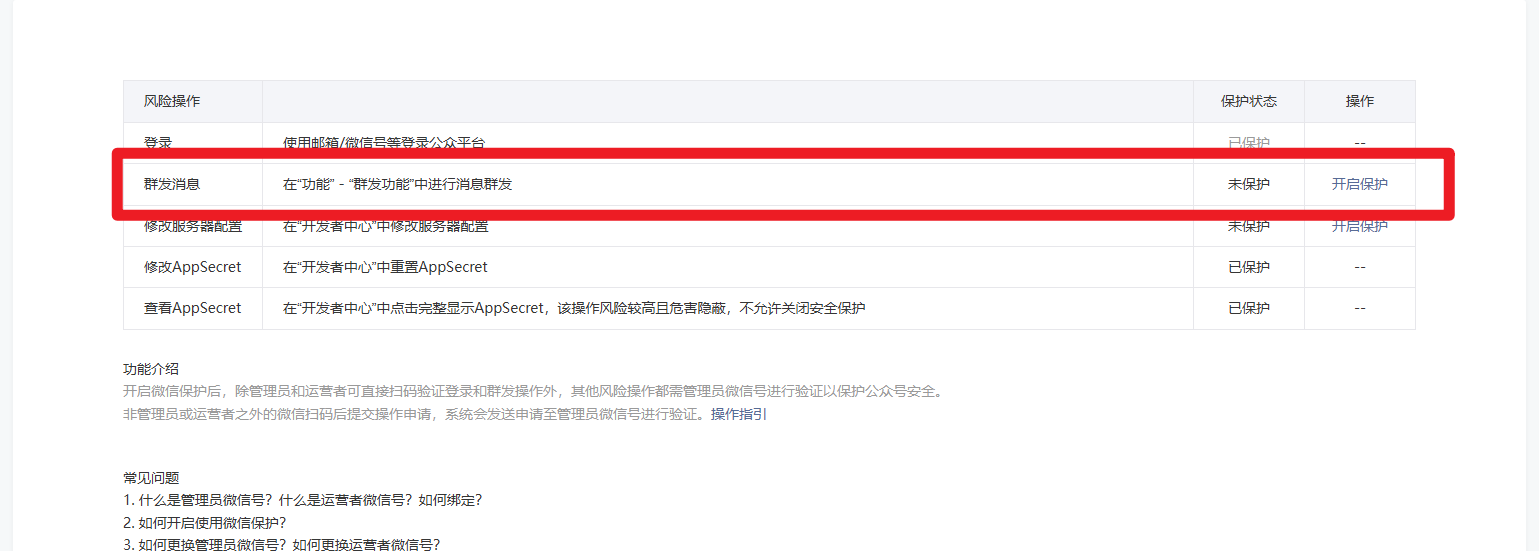 公众号后台——设置与开发——安全中心——风险操作保护,群发消息保护关闭即可。
