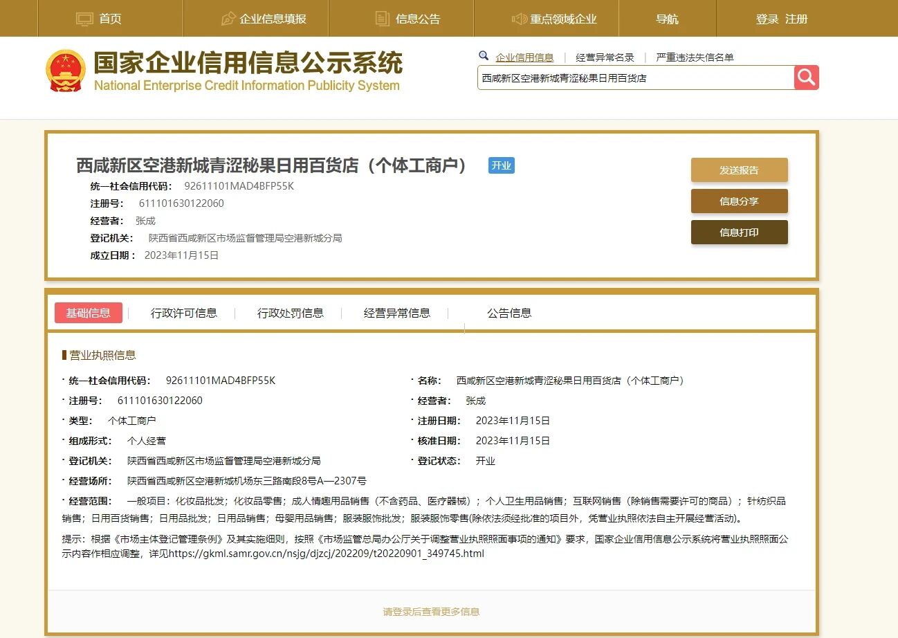 名称: 西咸新区空港新城青涩秘果日用百货店(个体工商户)
