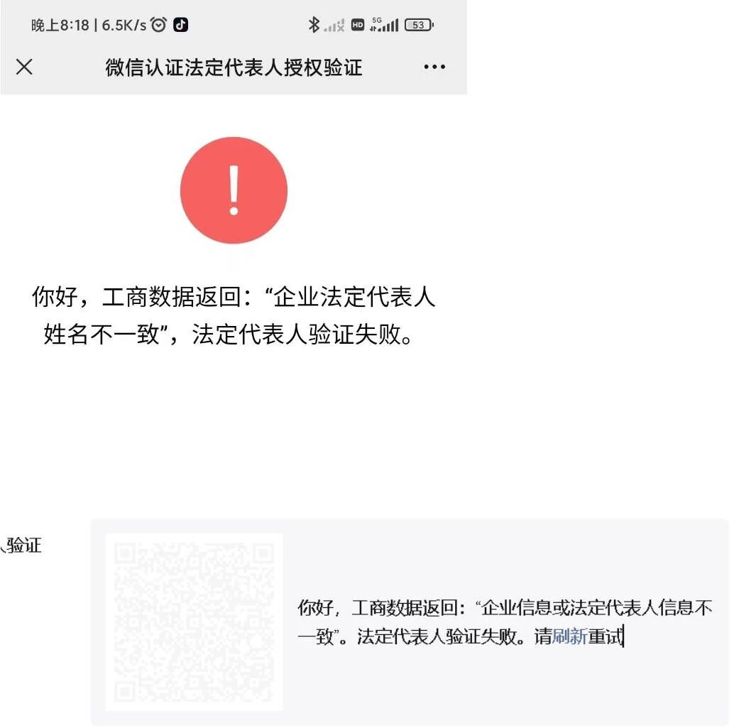 小程序注册,填写完资料后,进行法人代表验证,提示“企业信息或法人代表不一致”验证失败。企业(个体)信息及法人信息都是正确。填写的信息如下图