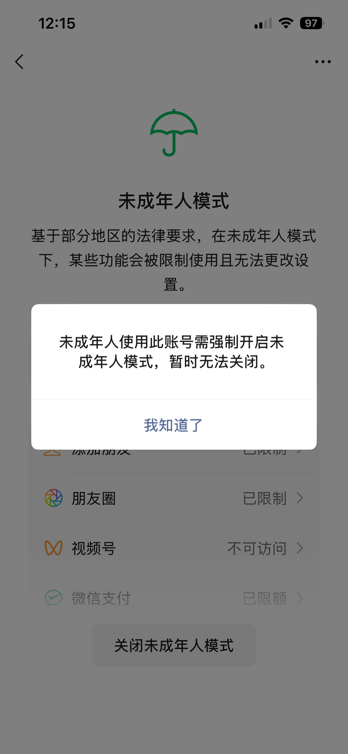 我的微信账号里的未成年人模式被强制开启 无法使用密码关闭 申诉多次没回应 该如何解决?