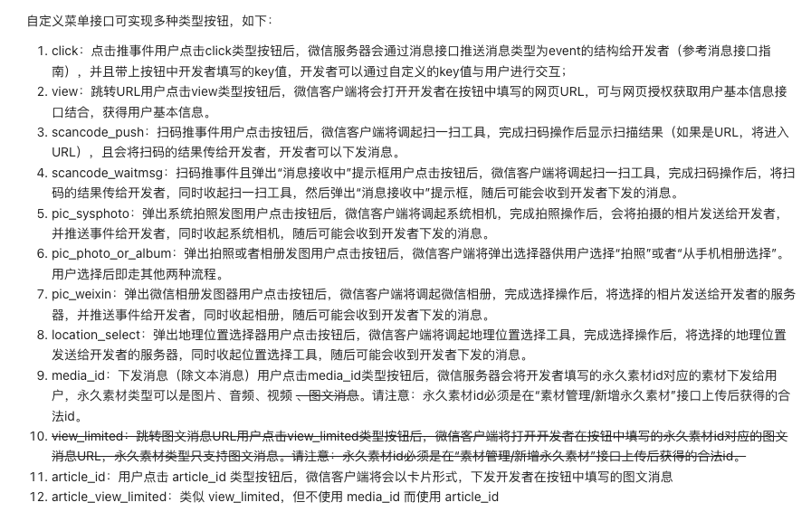 创建自定义菜单, 提交内容包含 type="text" 类型按钮,报错,提交菜单结构:{"button":[{"type":"text","value":"本校食堂消费采用人脸识别模式,具体情况请到校咨询。","name":"食堂消费"},{"type":"text","value":"地址:桂林市叠彩区胜利路49号\n网址:www.gl19z.cn","name":"联系学校"}}]}