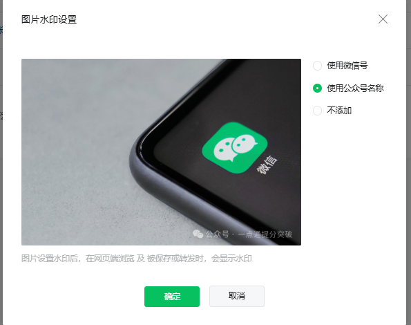 图二下面小字有提示呀,这个功能官方近期调整了,目前图片设置水印后,在微信内浏览不会展示水印,在 网页端浏览 及 被保存或转发时 才会显示水印。