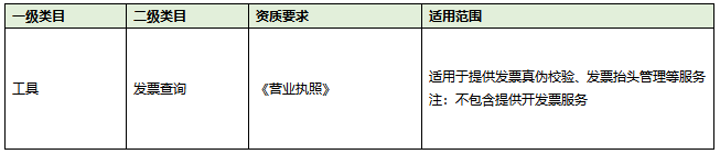 【工具-发票查询】类目:适用于提供发票真伪校验、发票抬头管理等服务。