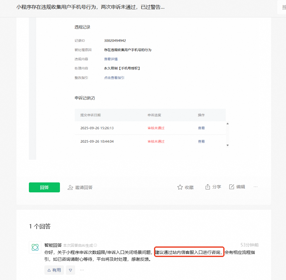 咨询了“关于小程序申诉次数超限/申诉入口关闭场景的问题”,智能AI回复“建议通过站内信客服入口进行咨询”。