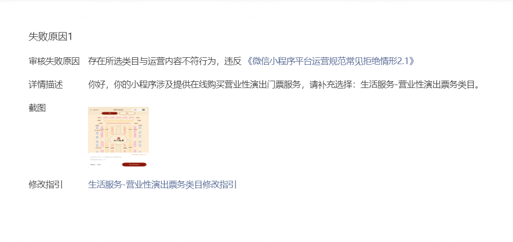 代码审核问题,小程序主要用于店内中餐和晚餐的订座预定,但是提交很多次审核都不给通过,说涉及提供在线购买营业性演出门票服务,真实是没有这一块的,且程序内没有任何带有表演和门票的字眼,望审核人员在再仔细看下,给予通过。