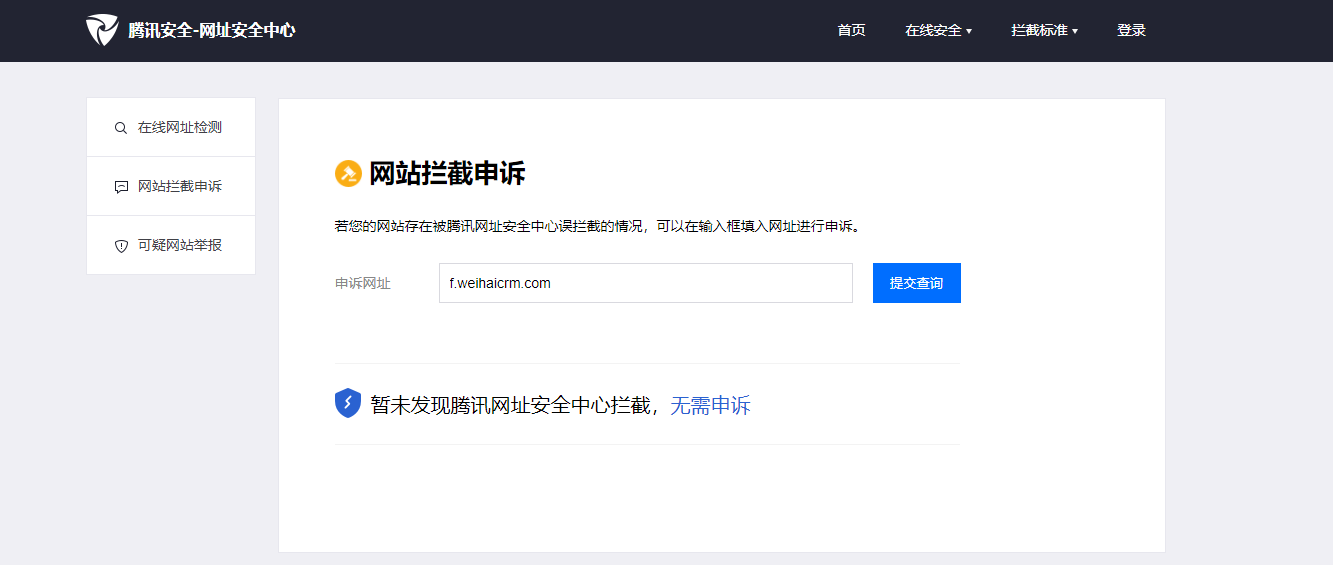 业务链接【f.weihaicrm.com】下方的某些子链接,在微信内无法正常打开(其他浏览器访问正常),经自查及腾讯安全检测均未发现风险,访问受限已直接影响用户体验及业务推广。请再次审核,并告知具体哪些行为违反了《微信外部链接内容管理规范》
