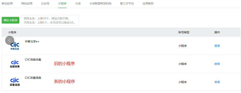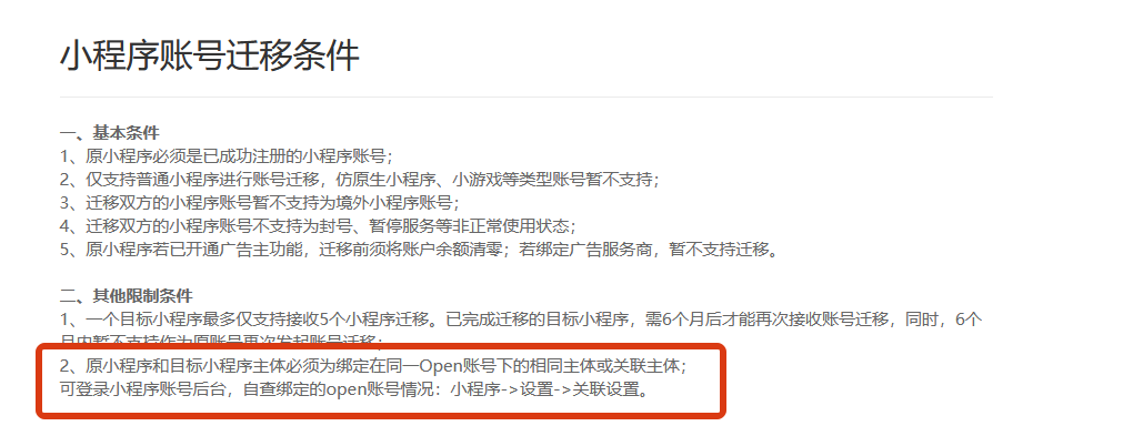 迁移条件:原小程序A与目标小程序B必须绑定在同一个微信开放平台账号C下。或者在微信开放平台账号C下,微信小程序的A的主体与微信小程序B的主体是关联主体。