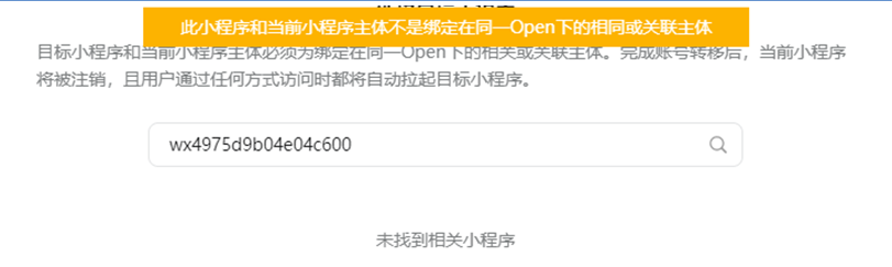 在原小程序中操作“小程序账号迁移”时,在选择目标小程序界面,无法搜索到目标小程序的AppID。截图如下: