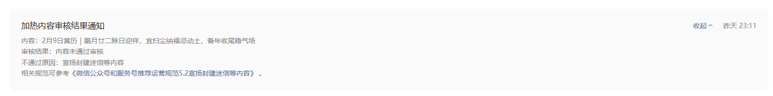 我的公众号发布的都是这种,类似老黄历的每日运势。这个是不是违规了。我很多都没有推流。我还要不要坚持下去,之前我付费加热都不通过,如果我这个类型文章不行,我能把之前的文章删除,重新从0开始做其他主体的文章吗?继续其他主体的这个账号后续会推流吗?