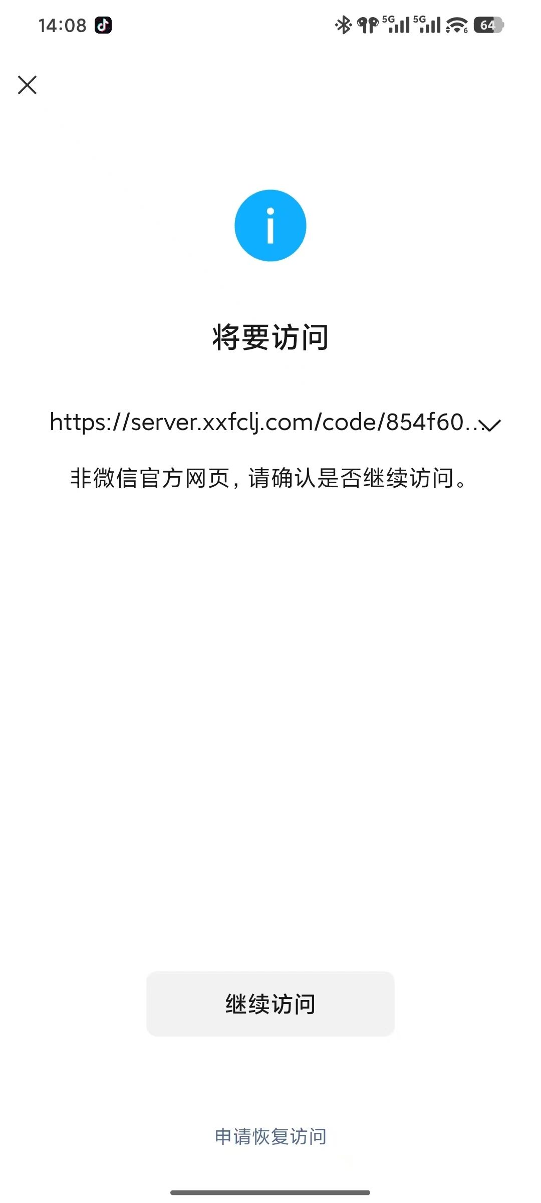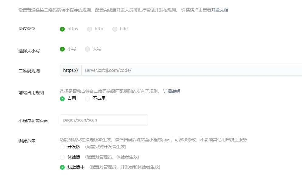 您好,我们开发了一个微信小程序,配置了扫描普通二维码进入小程序的规则且发布了,但是现在扫描二维码被微信拦截,导致无法跳转进入小程序,麻烦处理下,谢谢;小程序appid:wxde6b80ba443cbf25;规则如下:完整二维码链接:https://server.xxfclj.com/code/854f608e-5154-4602-980f-83fcabcc5eb5