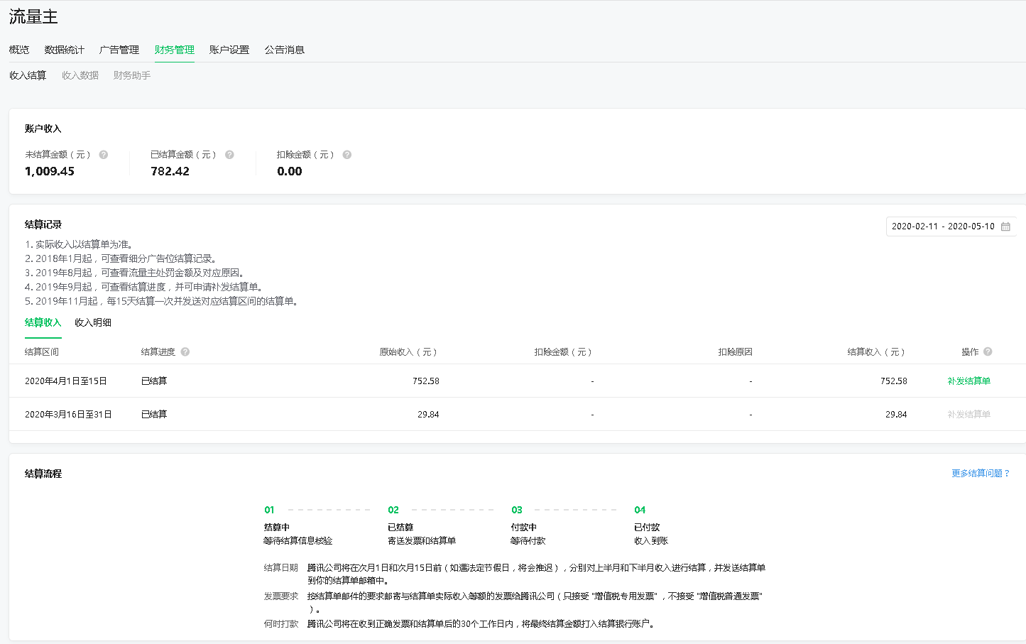 目前已通过"wxad@tencent.com"补发2020.03月下半月和2020.04月上半月结算单至贵司当前的结算邮箱,请注意查收。