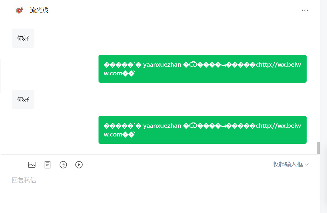补充一下,这个是微信公众号后台自动回复哈,已经登录微信开发者平台把域名与消息推送配置已经取消了,但是回复还是显示乱码。