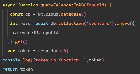 就算你自定义函数那里使用了await,你再调用这个函数的时候也是要写成Promise语法的,因为它这里还是异步的,你调用完后得等数据返回之后再做处理。 quaryCalenderInDB(e.detail.value.QDtextarea).then(res=>{console.log(res)});bindQDSubmit: function() { this.quaryCalenderInDB(e.detail.value.QDtextarea) .then(res => { console.log(res) }) }