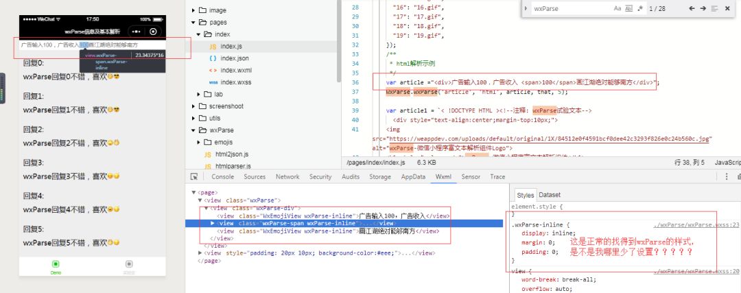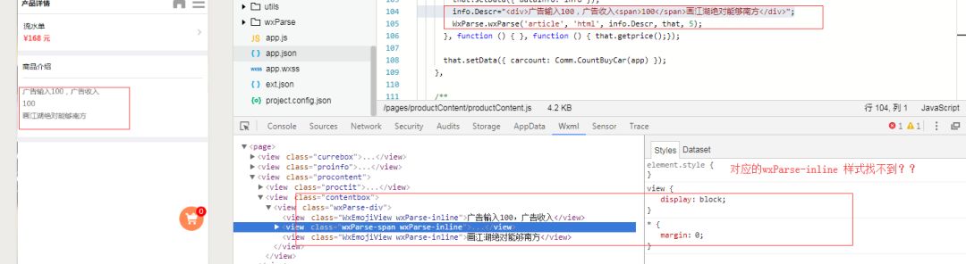 按照wxParse的使用说明,配置写上代码,wxParse.wxss样式找不到,导致页面的显示不对,span换行了,是不是我使用wxParse少了什么配置,找了一遍没什么不对,页面路径是正常的???求解