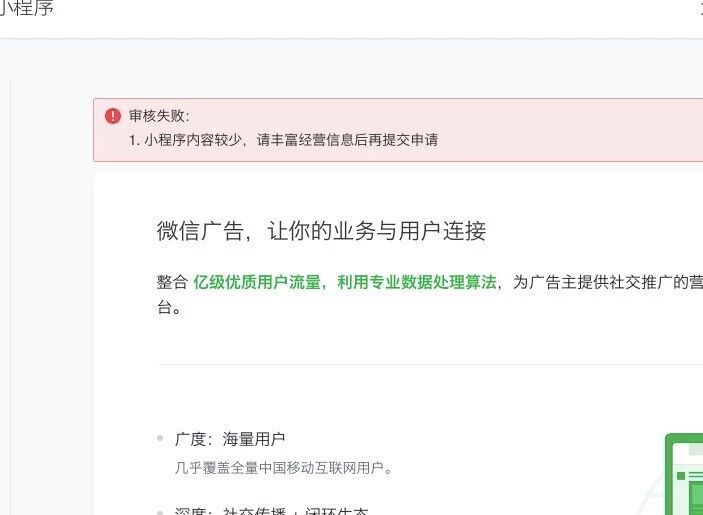 我们想要投放小程序广告,结果申请了6-7遍,每次都是同样的反馈:1. 小程序内容较少,请丰富经营信息后再提交申请