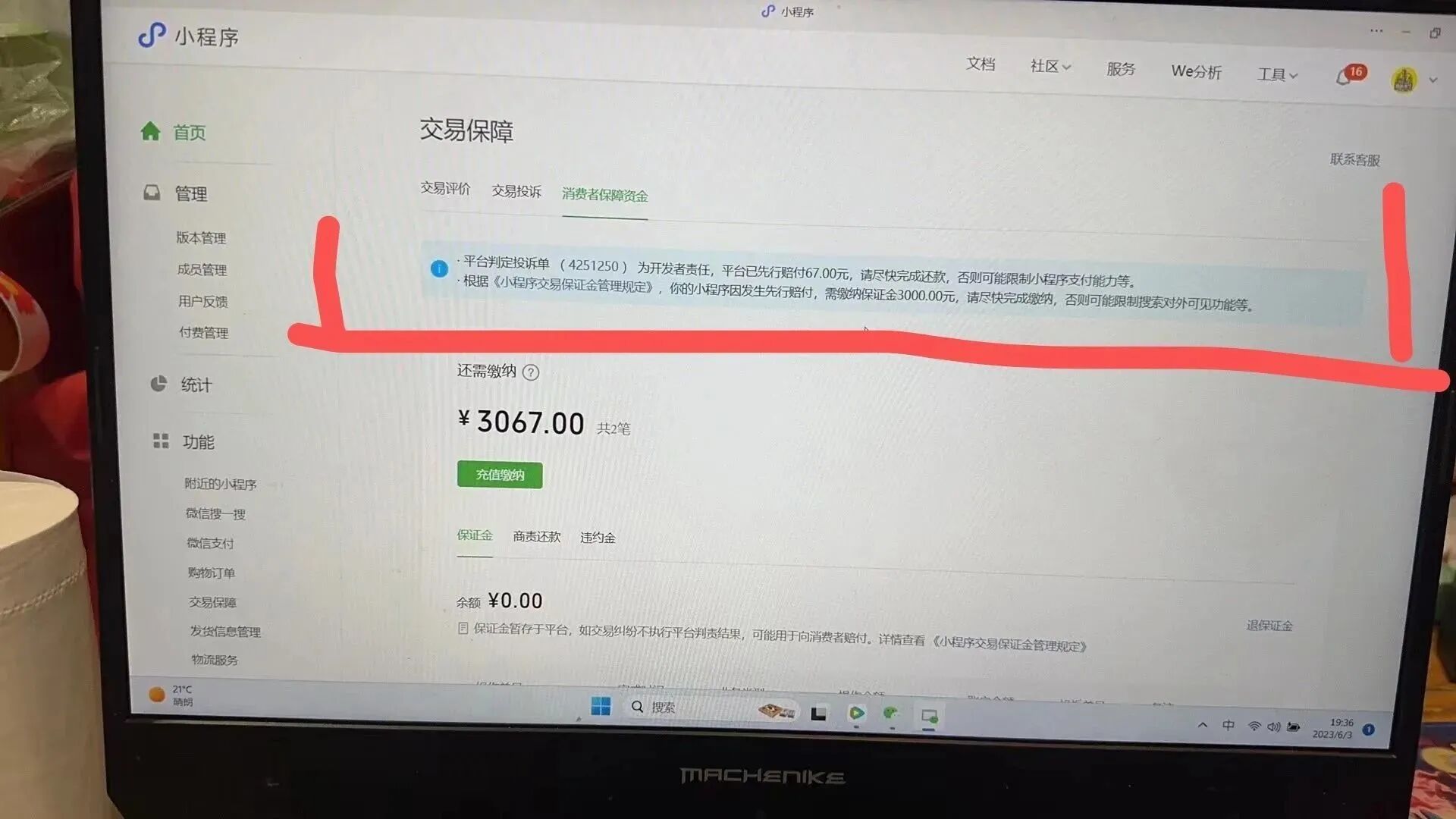 你的小程序在交易过程中出现投诉单,系统判定需要缴纳保证金才能继续交易。