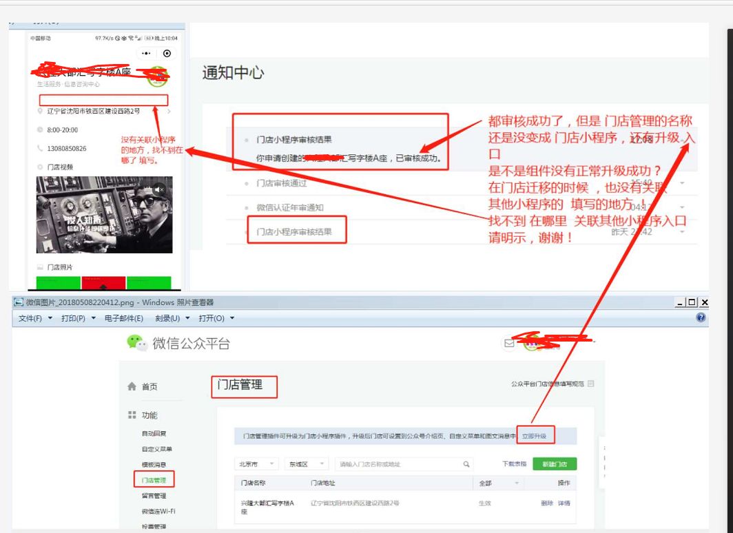 按门店管理升级门店小程序的教程操作后,提示成功添加门店成功但无法关联同主体小程序。如图