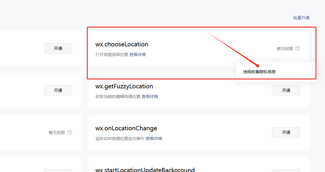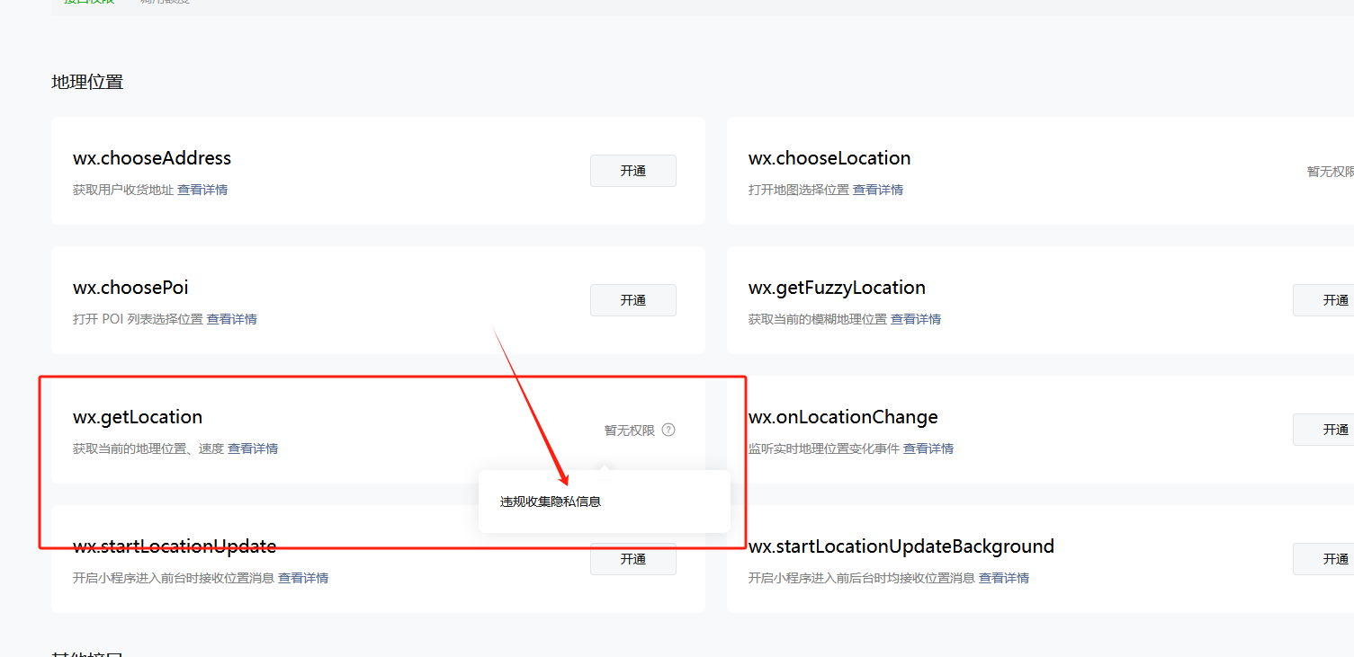 你好,可点击“隐私接口权限被回收”可查看问题排查指引文档:https://developers.weixin.qq.com/community/develop/doc/00062a6d514c88baacdf52e8a56009