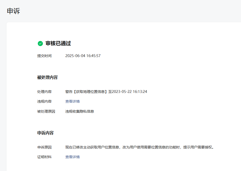 小程序appid:wx25d7ec0f84af4bd2 获取地理位置信息 申诉通过 但是仍不能重新申请位置服务