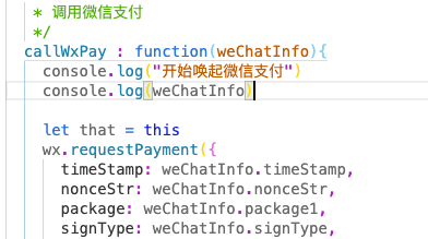 当无法唤起微信支付的时候,在界面上加一个测试按钮,点击事件绑定wx.requestPayment 无法发起微信支付。但是在手机调试console控制台手工输入wx.requestPayment ,能够唤起支付