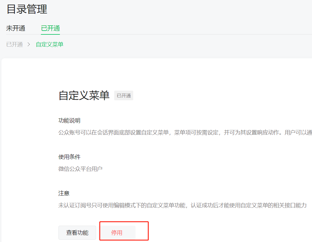 启用服务器配置后,公众号后台的自定义菜单将会停用并失效。