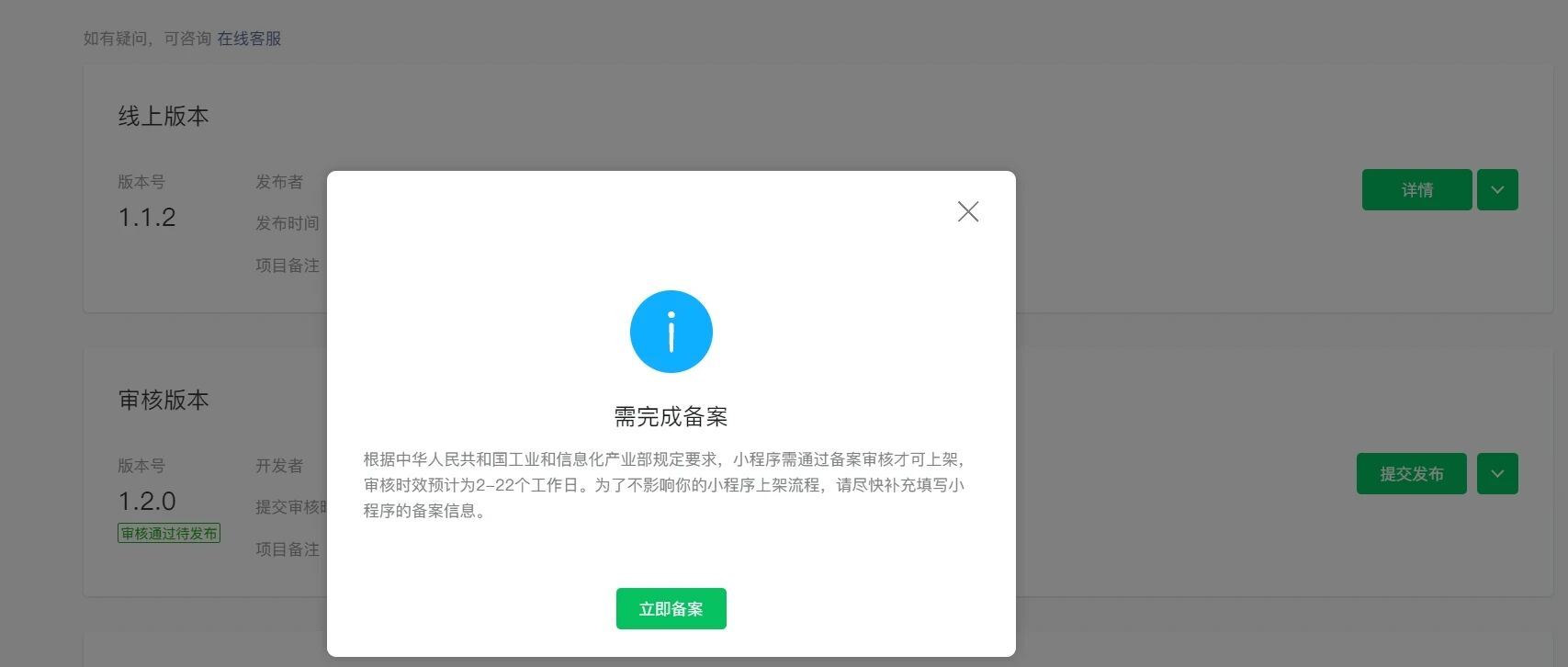 小程序备案已经通过,且已获得备案号蜀ICP备2024074787号-1X,之前发布小程序都正常的,现在发布新版本小程序提示需完成备案,麻烦看下什么原因。