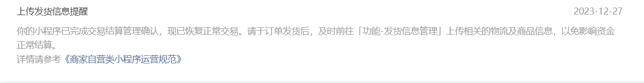 你好,麻烦了解下接口:https://developers.weixin.qq.com/miniprogram/dev/platform-capabilities/business-capabilities/order-shipping/order-shipping.html#%E4%B8%80%E3%80%81%E5%8F%91%E8%B4%A7%E4%BF%A1%E6%81%AF%E5%BD%95%E5%85%A5%E6%8E%A5%E5%8F%A3