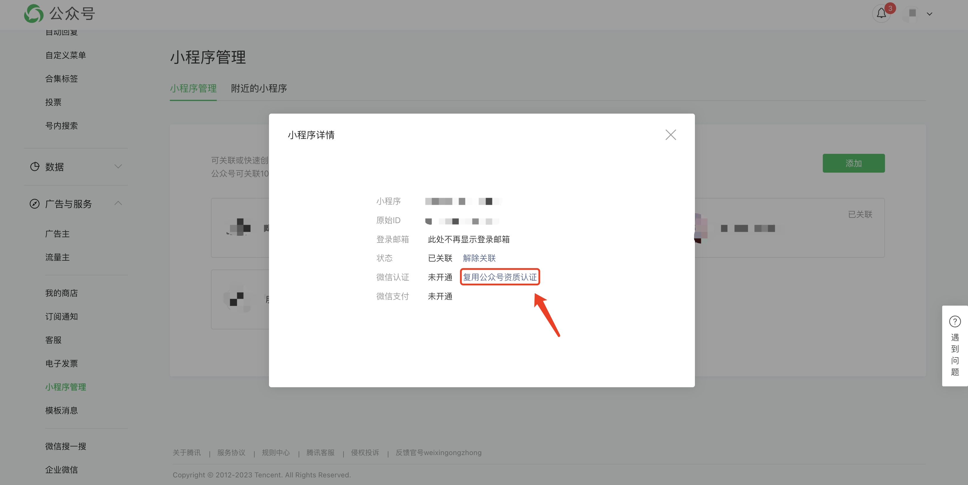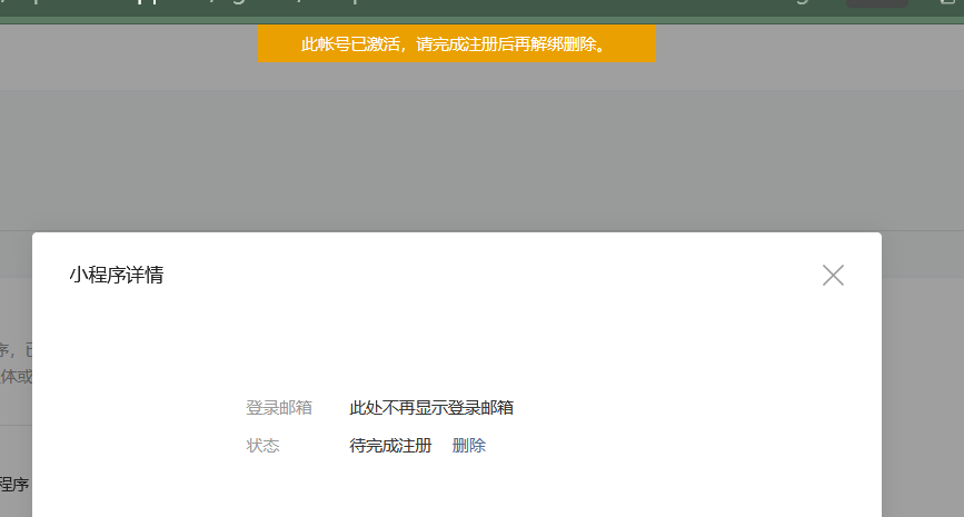 请问微信公众号资质开通小程序,邮箱激活后无法继续操作,微信小程序管理界面显示待完成注册点击无反应无法继续操作。