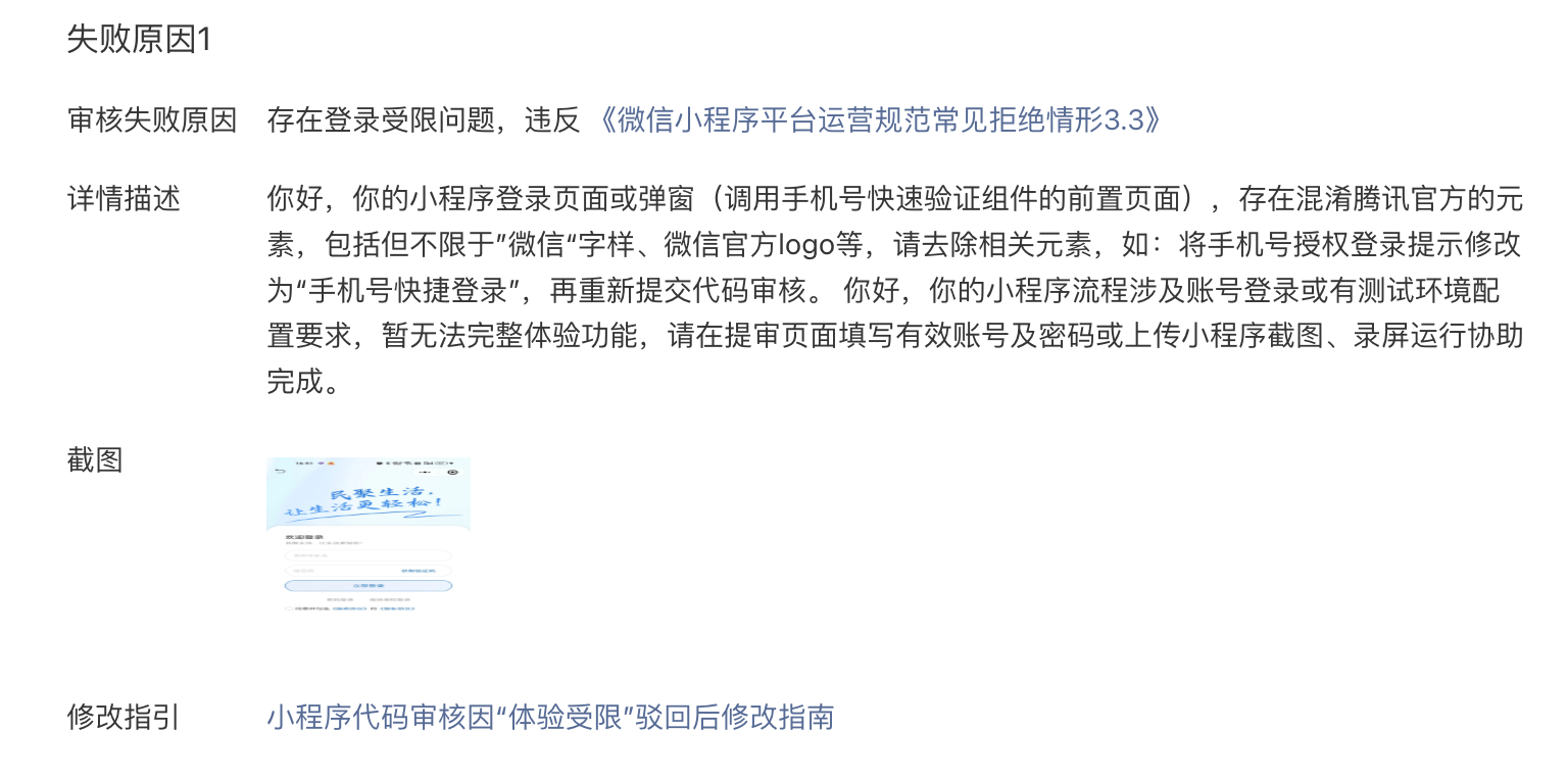 1.你好,你的小程序登录页面或弹窗(调用手机号快速验证组件的前置页面),存在混淆腾讯官方的元素,包括但不限于”微信“字样、微信官方logo等,请去除相关元素,如:将手机号授权登录提示修改为“手机号快捷登录”,再重新提交代码审核。