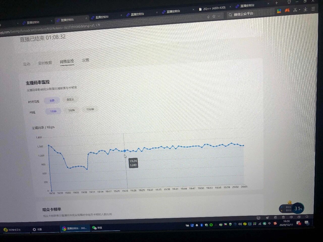 小程序直播12.10号与12.11号开启的直播均有卡顿现象(突然直播画面消失,开始转圈加载),码率正常,后切换网络,切换手机均无法解决(图中波动原因为切换手机及网络)。