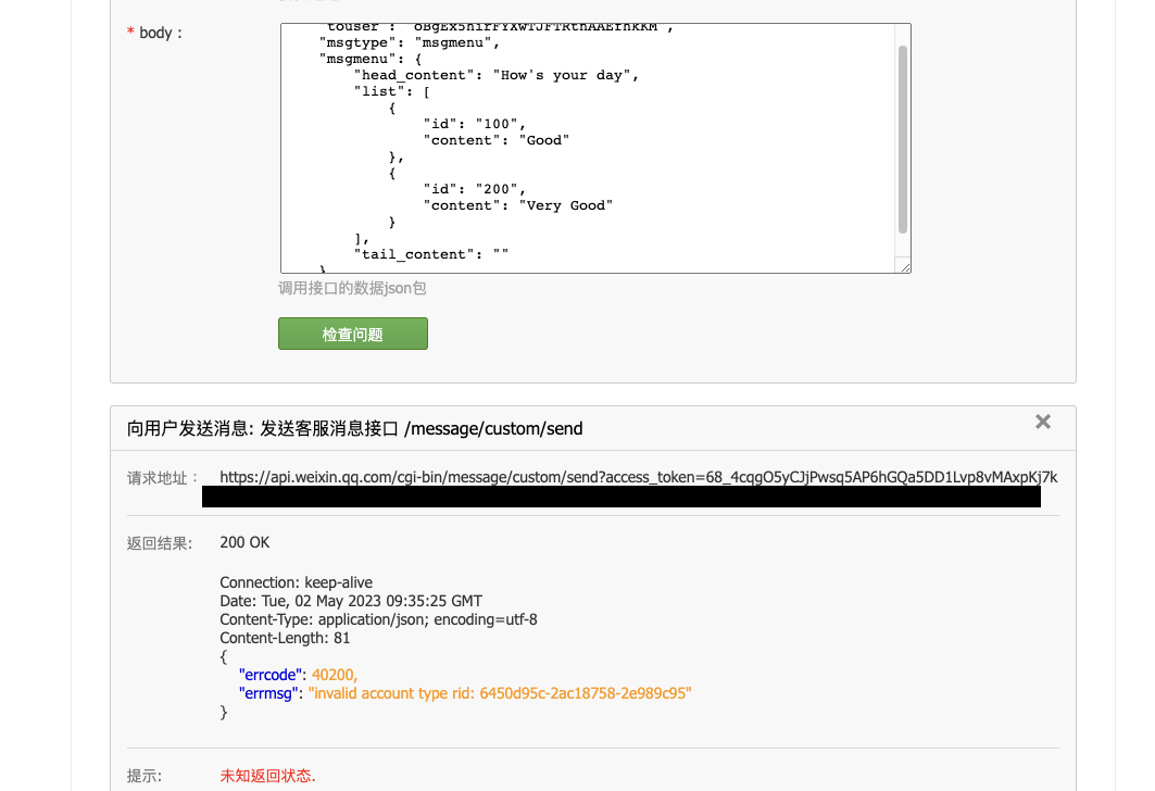 使用官方教程中的发送菜单消息教程,返回错误码40200
