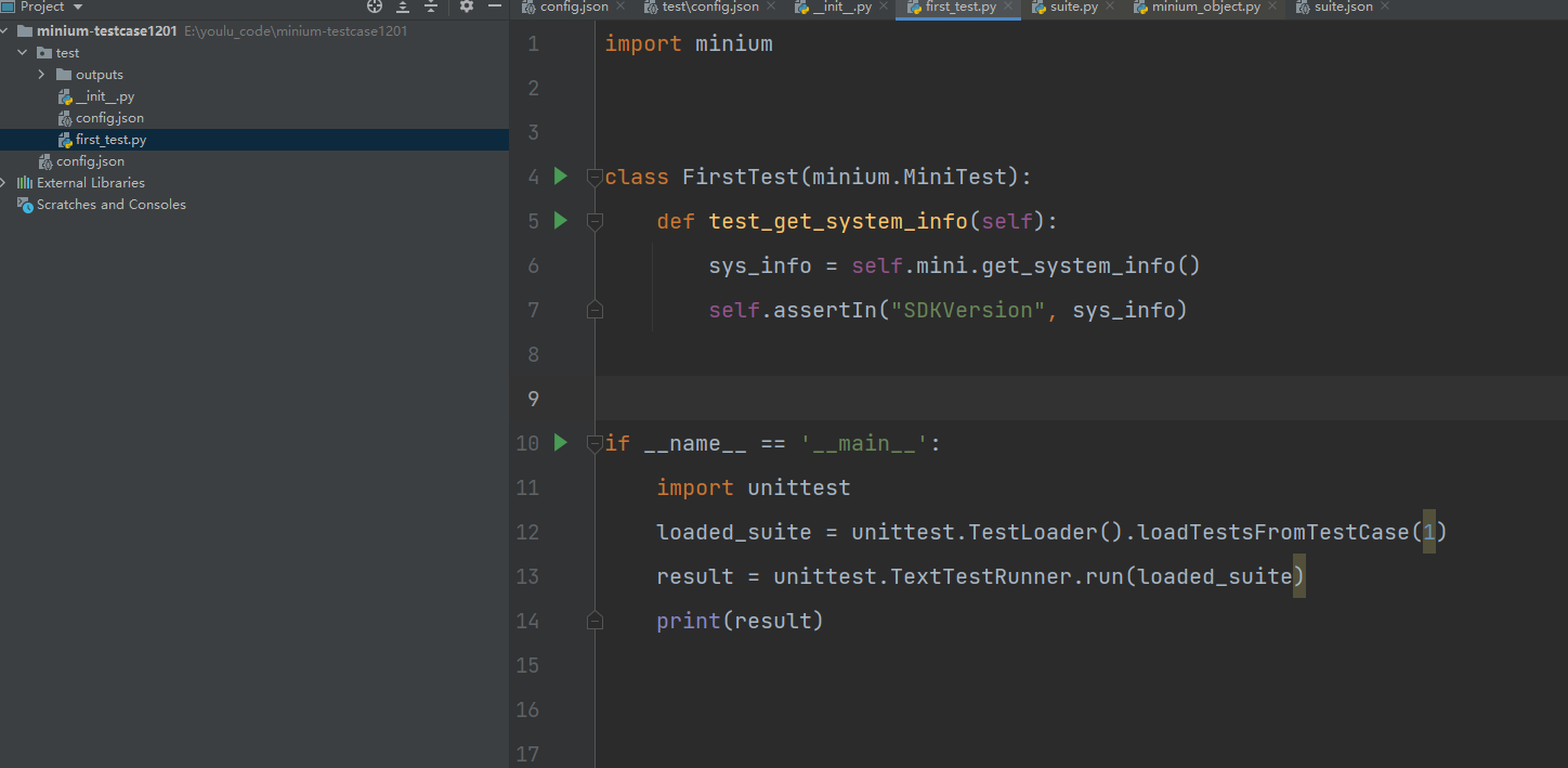 Launching unittests with arguments python -m unittest E:/youlu_code/minium-testcase1201/test/first_test.py in E:\youlu_code\minium-testcase1201\test