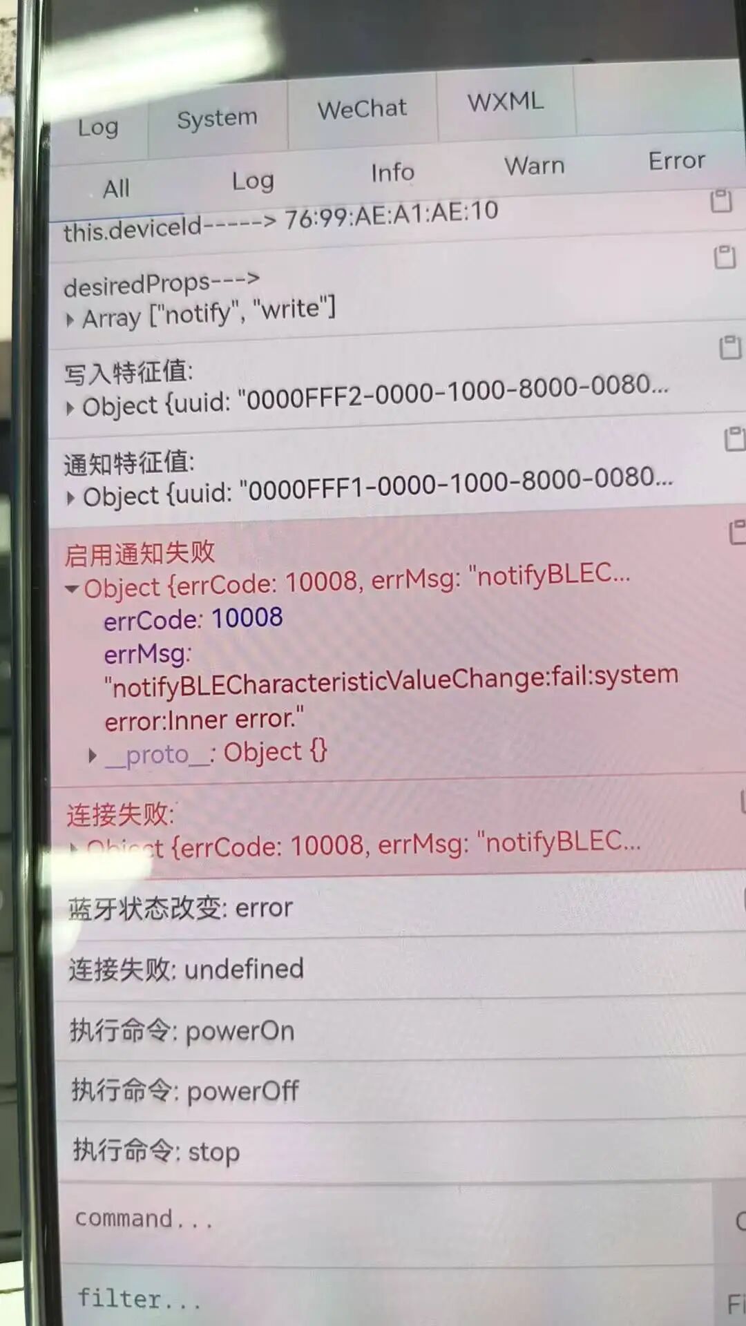 HarmonyOS : 能正常连接蓝牙,且蓝牙连接成功,但是在执行 wx.onBLECharacteristicValueChange 函数后,触发错误回调如下图