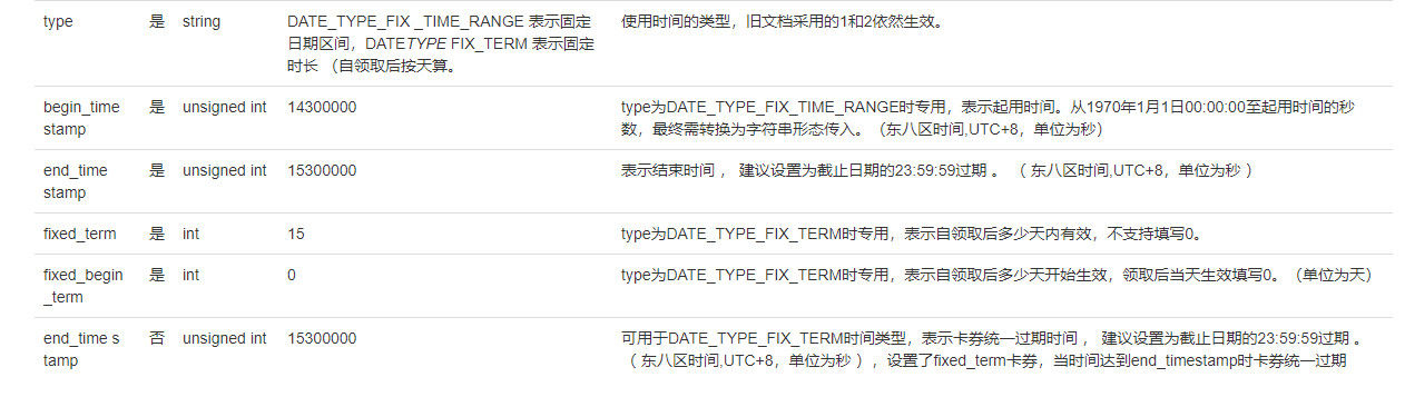 调用创建代金券接口,代金券类型为“CASH”,在data_info中设置type为2或DATETYPE FIX_TERM时,fixed_begin _term字段设置为0一直提示时间错误:invalid time :