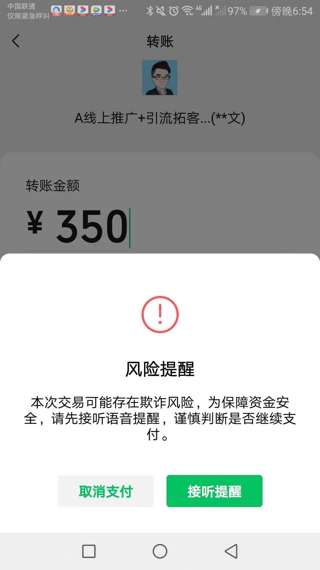 别人给我转账有这个风险提示,微信是自己工作的实名认证微信,为什么经常出现这种提醒呢,本来都谈好了的,客户一下子就不信任我们了、