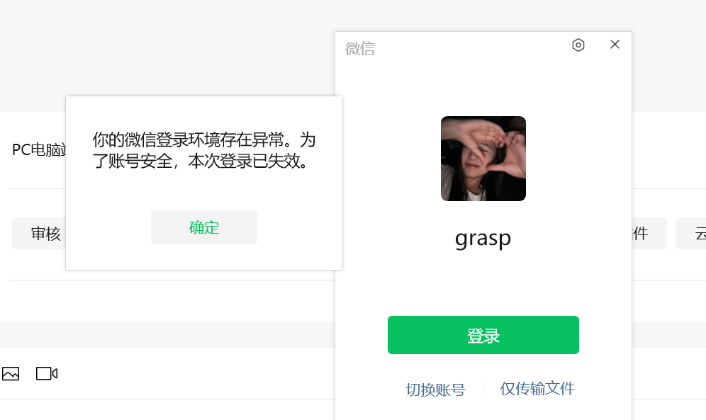 PC电脑端一直出现,微信登陆环境存在异常,为了账号安全,本次登录已失效,求大佬帮忙处理。 微信号:18382398025