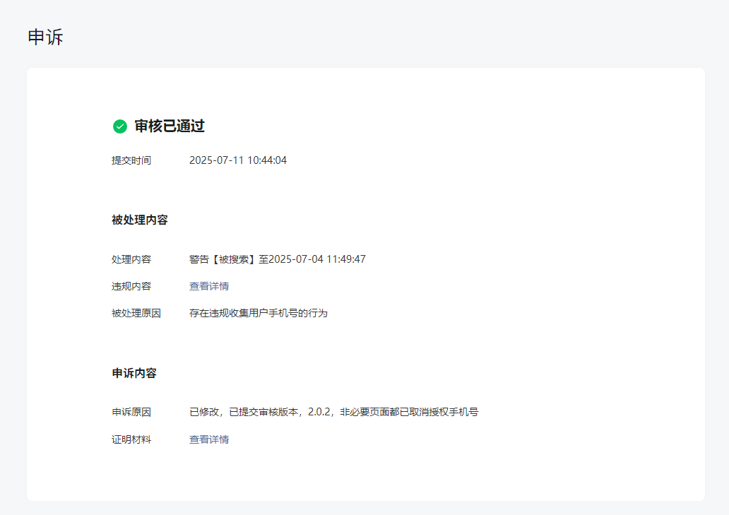 经核实,小程序收集手机号违规行为已整改,相关申诉已通过,请自觉遵守《微信小程序平台运营规范》及相关规则的内容和行为,谢谢。