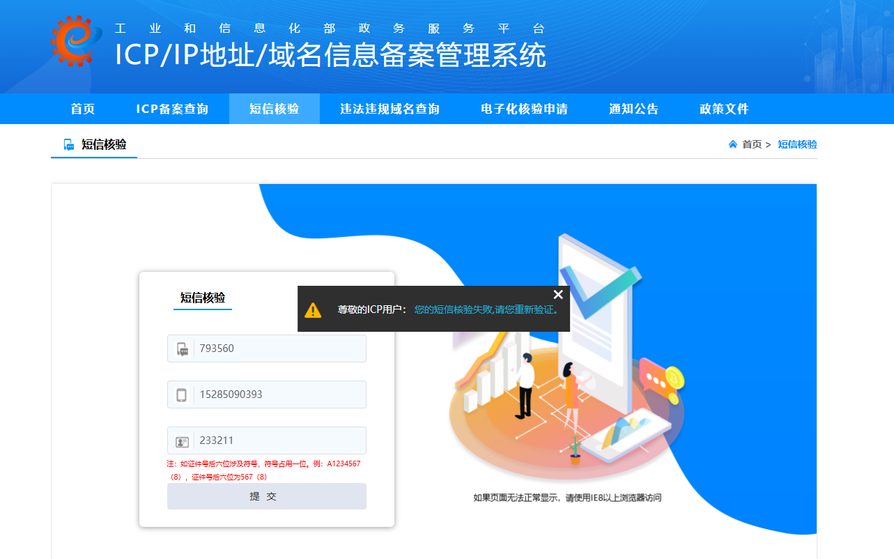 小程序备案,输入信息全部正确,但短信核验多次未通过,请问是什么原因?