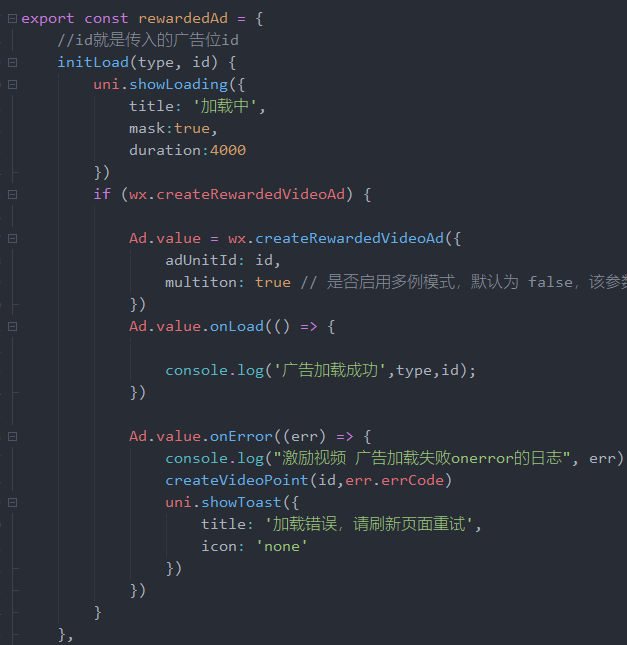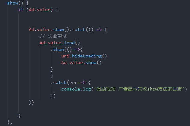 我的逻辑是这样的,点击按钮创建广告实例,紧接着show,show方法是按照官方文档加载失败重新拉取,广告正常播放,现在想让视频加载一次在show正常播放(目的获取真实拉取量,得到真实曝光率,得到真实ecpm),于是修改show逻辑,只有ad.show(),但是这样视频播放失败,一直走ad.show().catch逻辑,请问该怎么做?