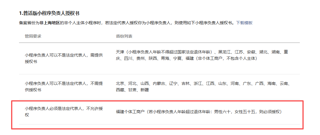 不同地区不一样,参考:https://developers.weixin.qq.com/miniprogram/product/record/record_material.html#%E4%BA%94%E3%80%81%E5%B0%8F%E7%A8%8B%E5%BA%8F%E8%B4%9F%E8%B4%A3%E4%BA%BA%E6%8E%88%E6%9D%83%E4%B9%A6