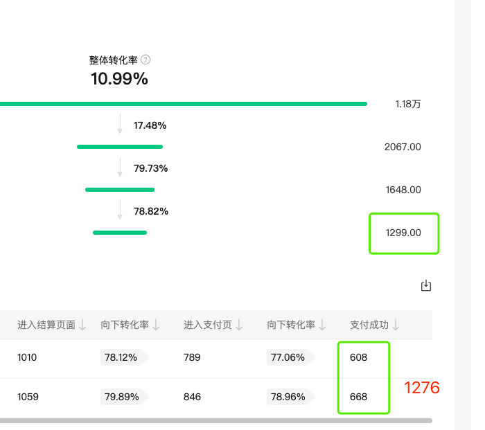 如图中所示 支付成功的漏斗信息的右侧有1299 ,但是报表中两天的相加只有1276,这个是什么情况 ,有官方能给解答一下吗?