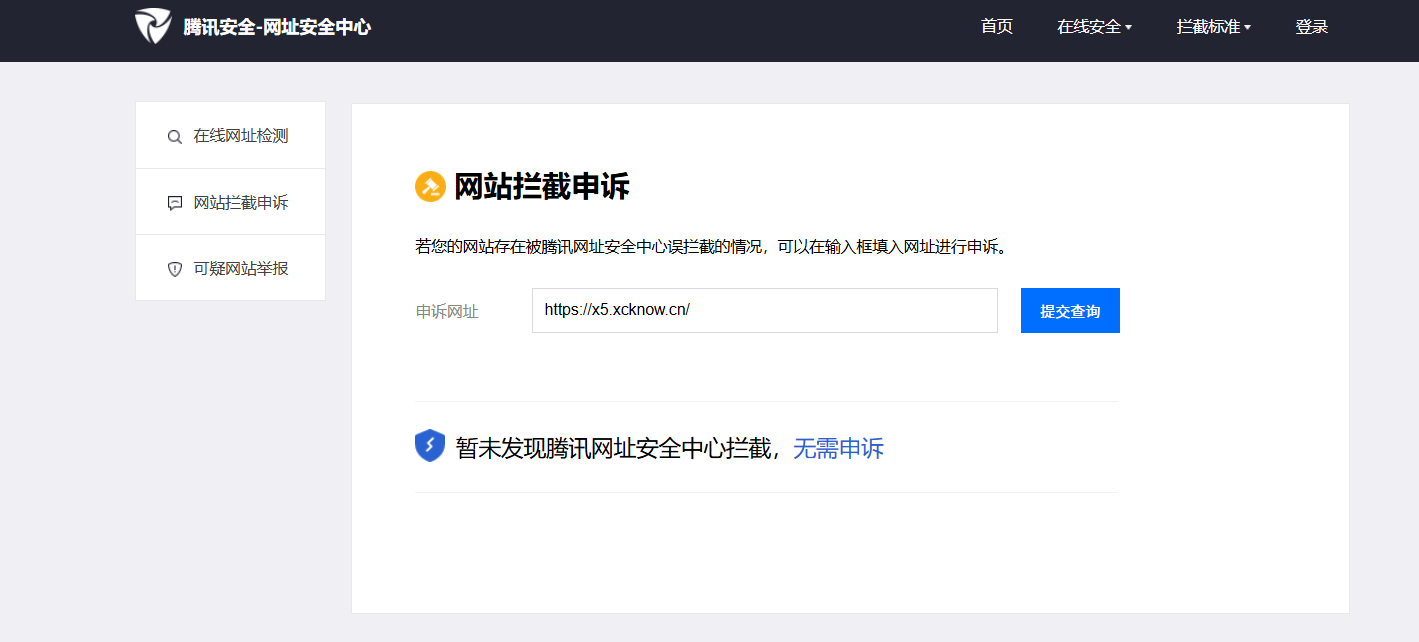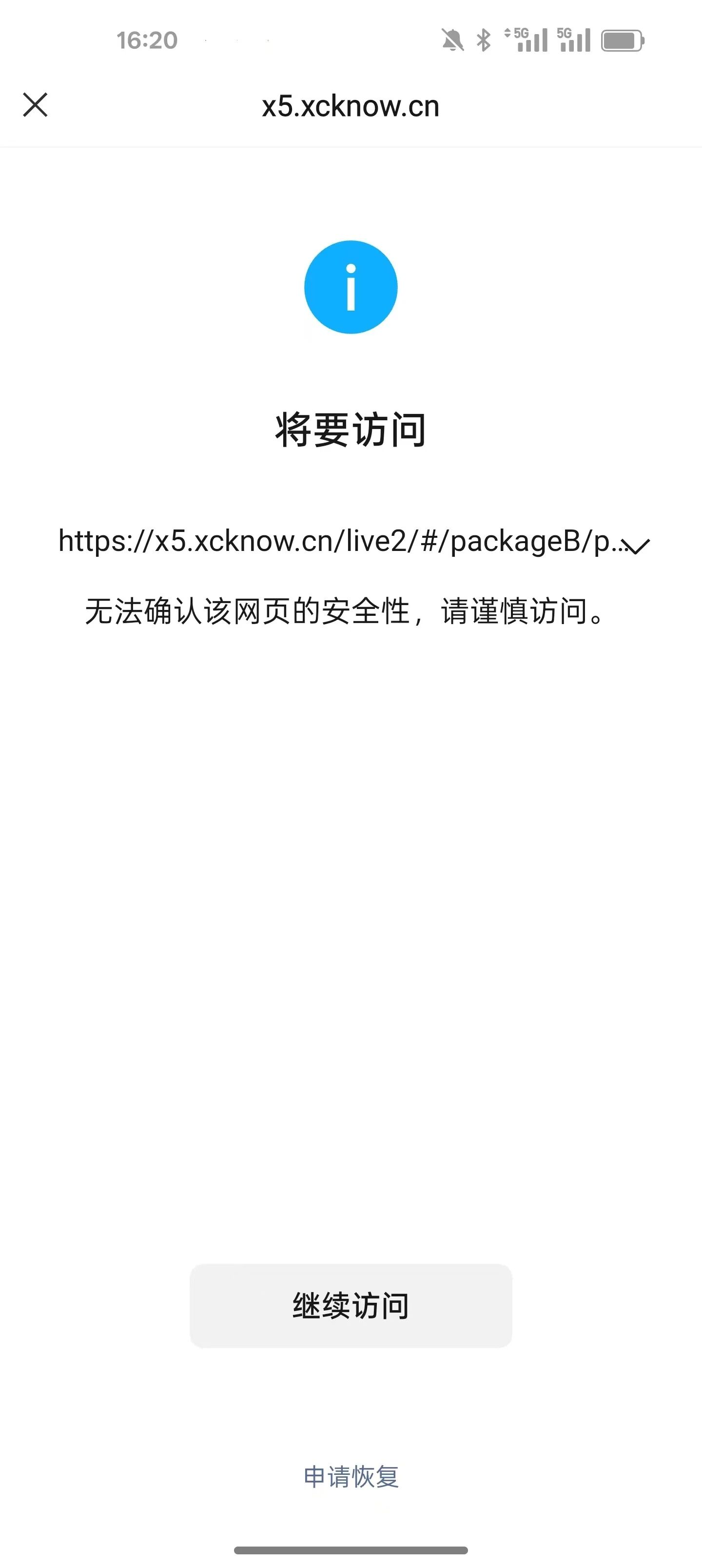 微信内访问网站出现“无法确认该网页的安全性,请谨慎访问”的拦截提示,备案号浙ICP备2023034560号,域名【x5.xcknow.cn】网站符合《微信外部链接内容管理规范》,腾讯安全网址安全中心检测网页没有不安全的内容,请求核实后解除在微信内的访问拦截提示,谢谢