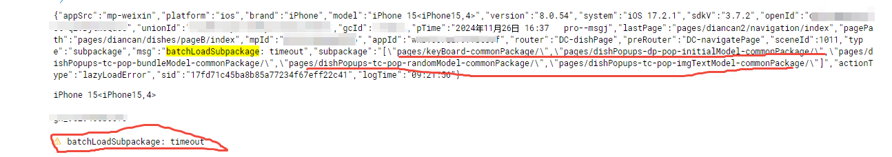 下面的截图就是通过wx.onLazyLoadError捕获到的下载超时日志。其中的subpackage的数组字符串就是wx.onLazyLoadError回调函数返回的内容