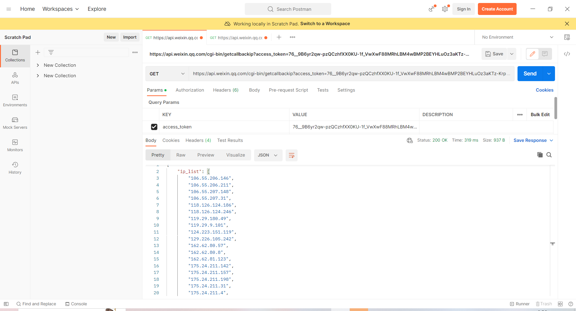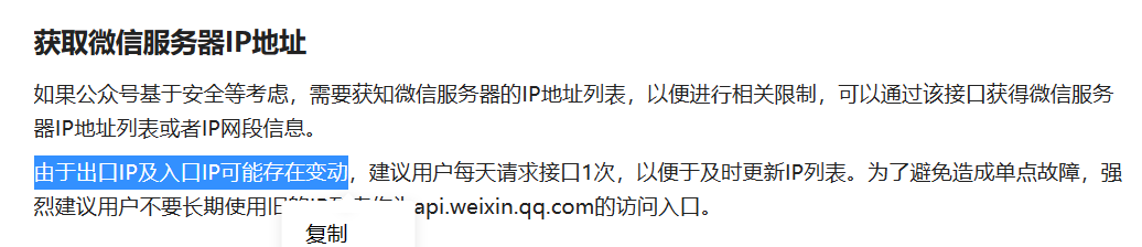 我用postman从https://api.weixin.qq.com/cgi-bin/getcallbackip?access_token=ACCESS_TOKEN接口获取到的iplist从来没有变化过,就是官方手册举例的ip,跟官方描述的可能会有变动不符,是什么原因呢