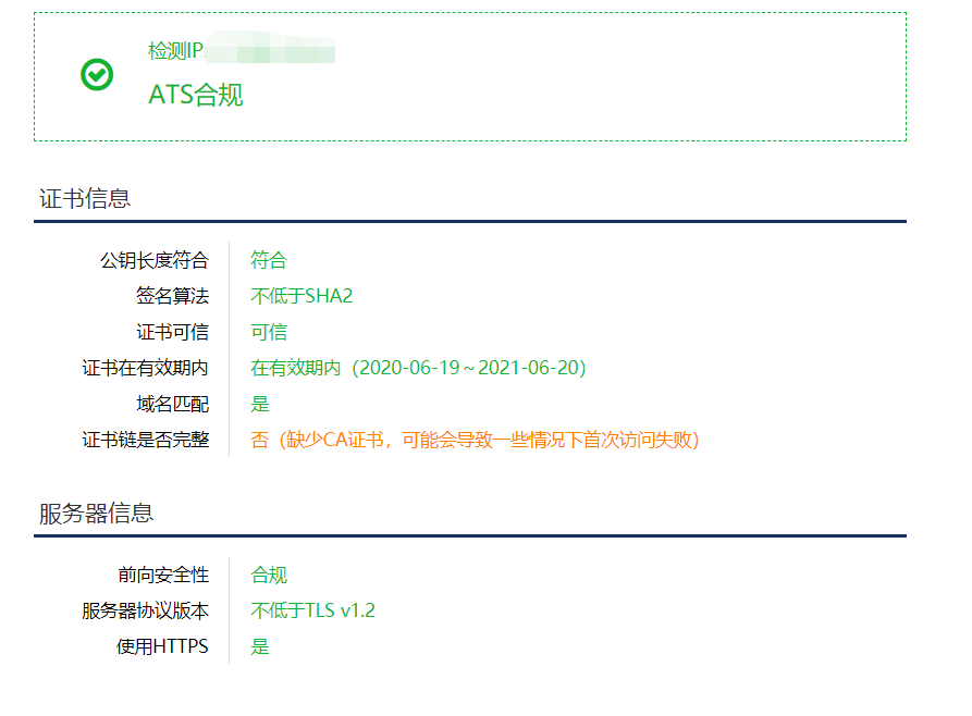 你好,小程序在测试的时候,部分机型请求成功获取了数据,但是另外部分的机型网络请求失败,真机调试的结果显示是errMsg: "request:fail net::ERR_CERT_AUTHORITY_INVALID",证书是腾讯云购买的。 后来去https://myssl.com/ ssl状态检测了一下网址发现是“无法连接”,ATS检测是合格的但是提示说“缺少CA证书,可能会导致一些情况下首次访问失败”,我想问一下是不是因为CA证书这个原因造成请求失败
