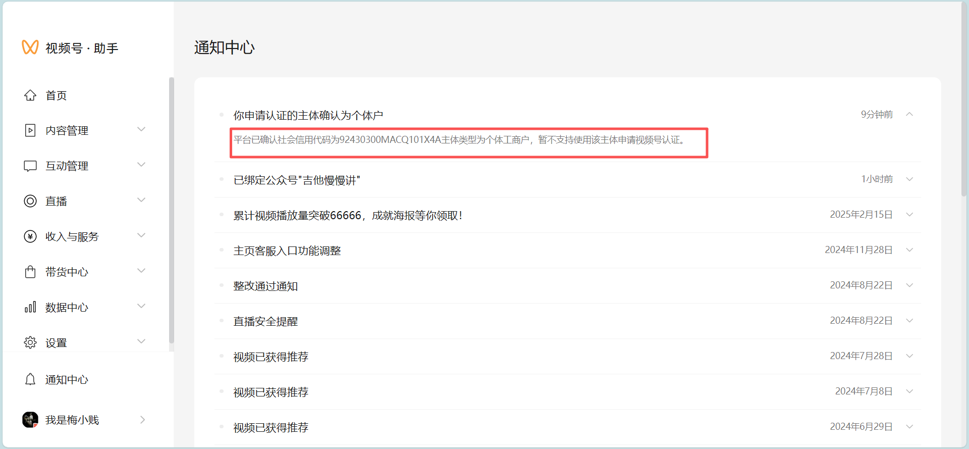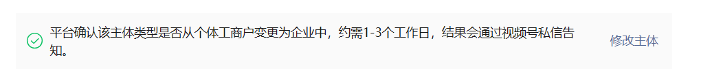 于是便采用视频号单独认证。电脑端提交时,似乎又说蓝V企业认证不让个体工商户了嘛?手快多点了一步,目前现在是如下图状态