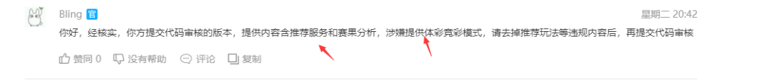 我们小程序页面只包含资讯列表,资讯详情,开奖公告,如上图的三个页面,提供内容含推荐服务和赛果分析,涉嫌提供体彩竞彩模式等,急急急!!!!!