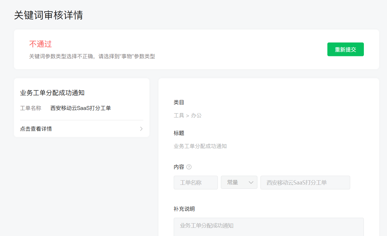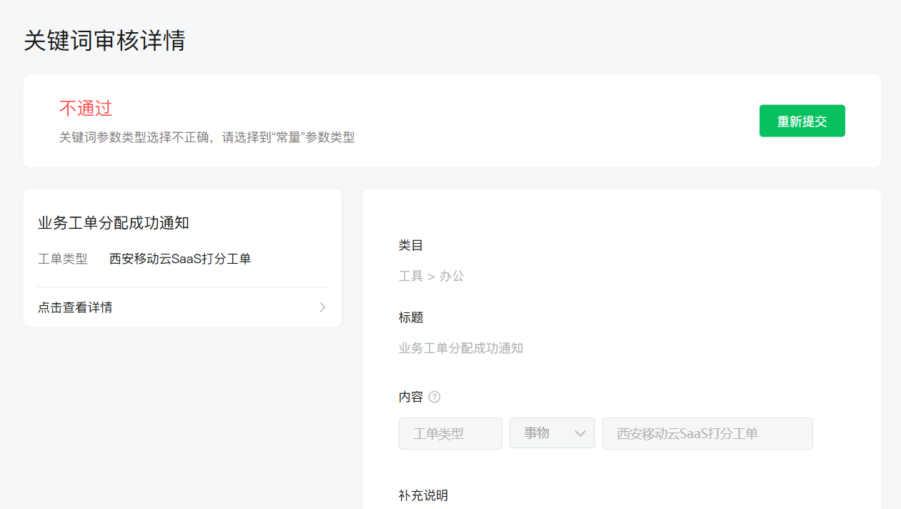 你好,类目模板对关键词有不同的参数类型限制。关键词【工单名称】与【工单类型】两者使用参数不同,【工单名称】请选择到“事物”参数类型,【工单类型】请选择到“常量”参数类型。参数值内容限制说明请参考:https://developers.weixin.qq.com/doc/offiaccount/Message_Management/Template_Message_Interface.html#rd